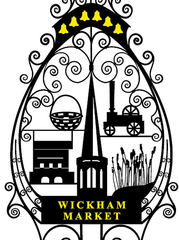 • The sharp spire of All Saints’ church Wickham Market dominates the village sign as it does the Suffolk landscape. The unusually high church tower ‘grew’ from around 1384 and has been a landmark well over 600 years. The sign also highlights its six bells.